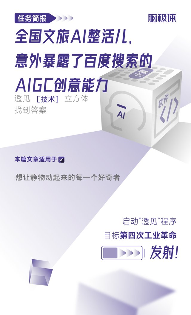 一只AI恐龙所掀起的文化传播变革,才刚刚掀开了一角。用AI解决了“视频生成”这个复杂任务,这或许是赵立坚点赞的核心原因:各地文化正在科技的催化下,完成一次生动的AI实践和赛博觉醒,以更酷的方式与我们相遇。一只AI恐龙的出逃或许会落幕,但它开启了AI完成复杂任务的起点,也是各行各业想象力与生产力被AI释放的起点。百度搜索的AI能力还会在未来不断影响人与技术、文化与技术的连接方式。