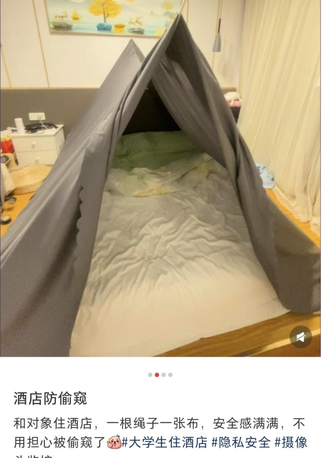 2月份,网友“徒灰灰”在社交平台发布了一则“酒店搭帐篷”教程:一根5-6米的绳子、一块4*3左右的防尘布,几个u型粘钩,成本20几元,就在酒店床上搭起了一个简易的防偷窥帐篷。