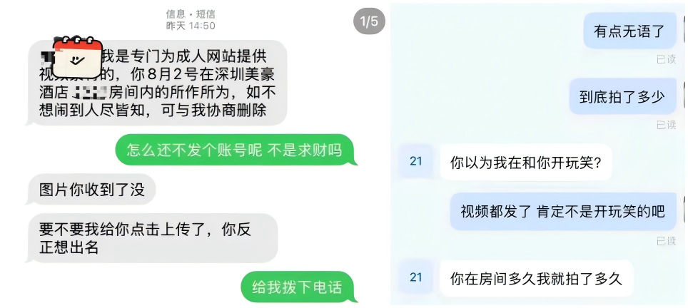 “两人在房间多久,视频就拍了多久。”收到这条勒索短信时,小刘(化名)的手止不住颤抖。