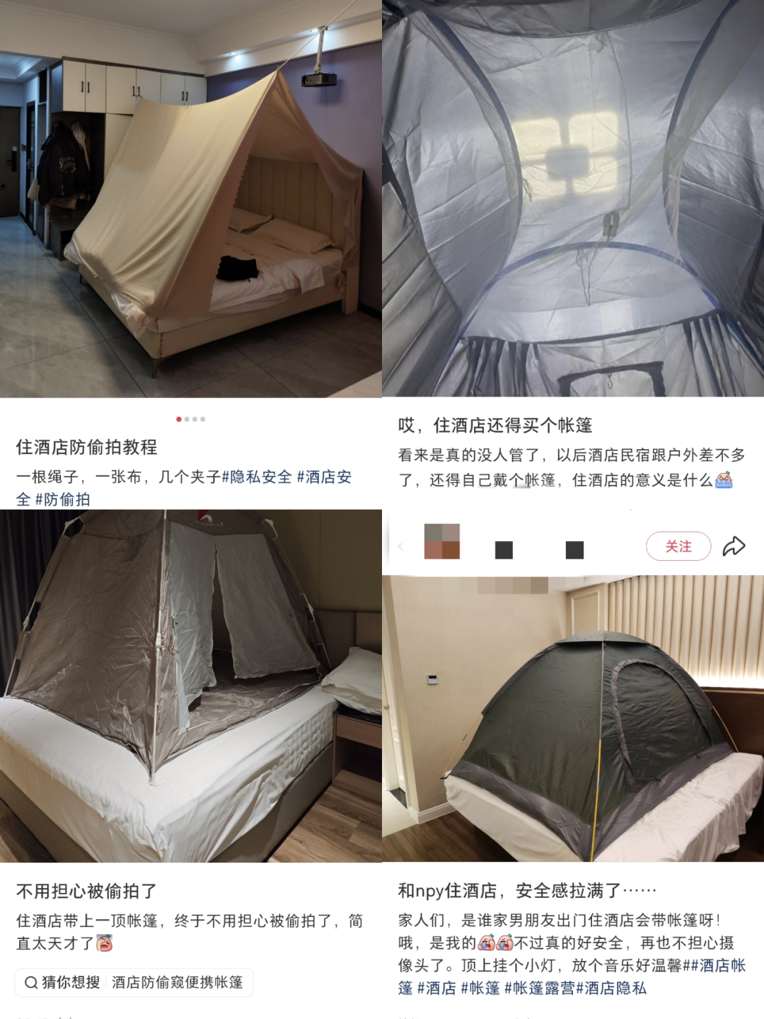 实际上,类似因恐惧偷拍,选择在酒店搭帐篷的案例并不罕见。某社交平台#酒店防窥帐篷 浏览量超过4万, #酒店帐篷 浏览量1510.6万,8.4万讨论; #酒店防偷拍 浏览量3280.4万,超3.9万人讨论。