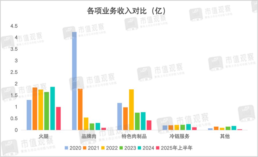 金字火腿之所以陷入困局,一是火腿业务面临天花板,自2021年以来板块收入一直维持在1.8亿左右,同时受猪肉价格下滑影响,品牌肉板块收入在2020年至2024年间从4.24亿萎缩至仅0.31亿,对整体收入造成了明显拖累。