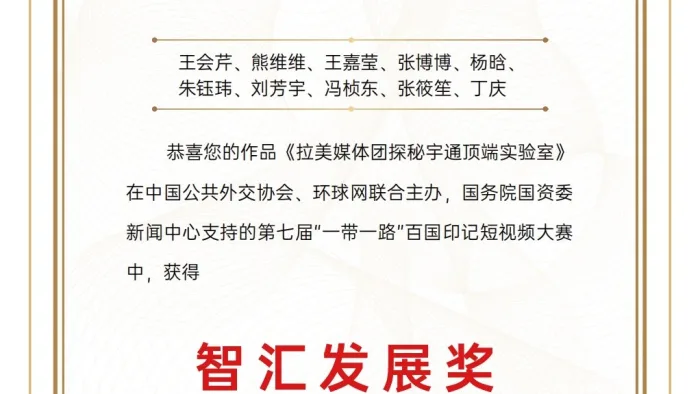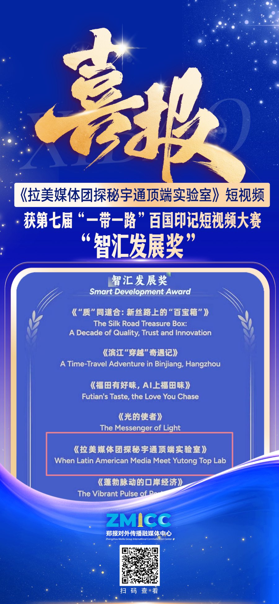 近日,第七届“一带一路”百国印记短视频大赛奖项揭晓,由郑报·对外传播融媒体中心创作的短视频作品《拉美媒体团探秘宇通顶端实验室》从全球众多参赛作品中脱颖而出,荣获“智汇发展奖”。该赛事由中国公共外交协会、环球网联合主办,国务院国资委新闻中心支持,具有广泛的国际影响力。