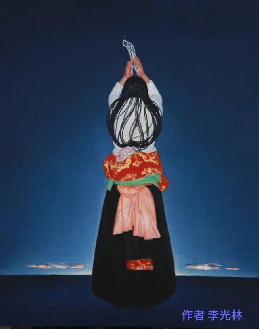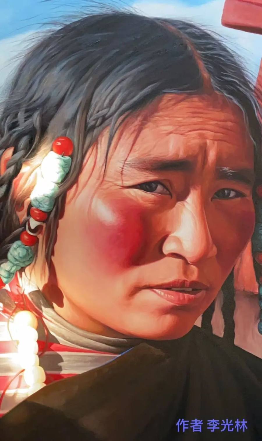 从油画创作的角度来看,李光林先生的作品是属于毫无疑问的写实派,只不过相比别人,他的画则是更多了一些情感化的表达。油画笔触尊重对人物写实的基础,但在每一双深邃的眼眸后面,却又都蕴藏着藏区人民所具有的独特气质,这种直抵灵魂的感染力,正是许多写实画家作品中所欠缺的。或者也可以说,这是李光林先生长期扎根写实生活的必然结晶。从表面看,他描绘的是一个个鲜活的人物形象;往深处看,实则是将民族文化的精髓与风情,都浓缩在了人物题材之中。而这种鲜明的文化内涵彰显,也是让我们得以窥见李光林先生艺术心灵的细腻与深沉。