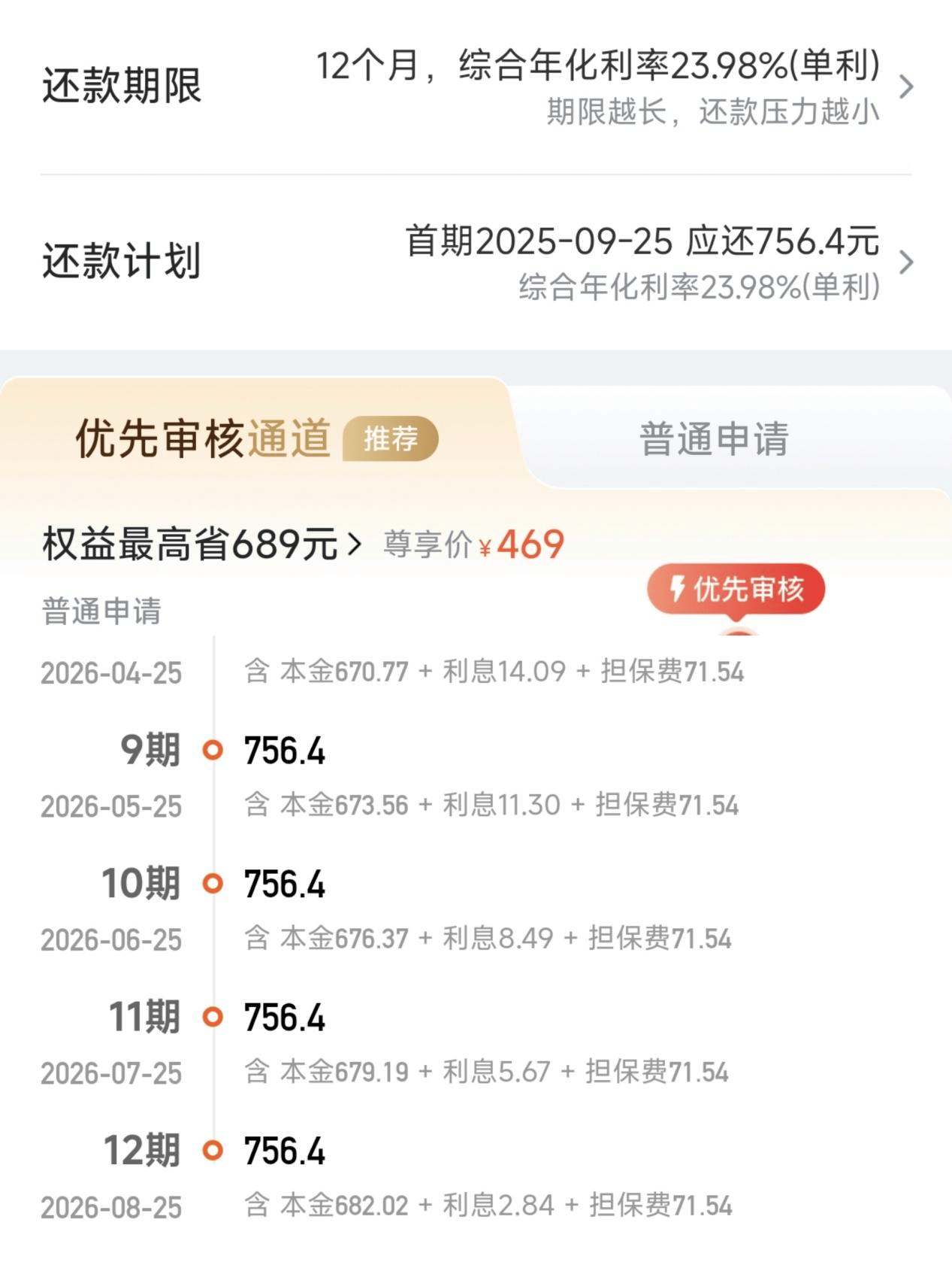 还款计划显示,12个月还款计划的应还总额为9076.8元,每期还款756.4元,这其中除了本金和利息外,还有71.54元的担保费,12个月合计达到858.48元,而12个月总利息仅218.32元,前者是后者的近4倍。