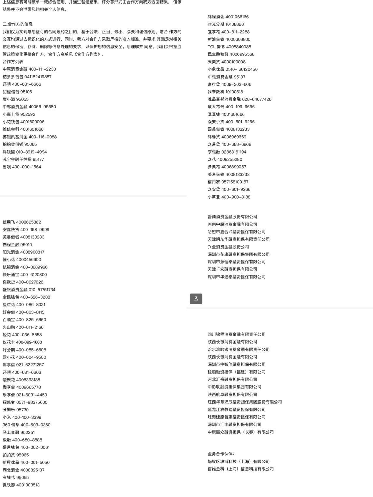 让人质疑的协议不止于此。哈啰臻有钱在自我介绍中展示的合作伙伴,仅有中原消费金融、度小满、晋商消费金融、信也、信用飞5家。但其究竟合作了多少机构,笔者仔细查看一步步需要签署的协议,都没有找到。最终也是在借款界面的“我的”-“设置”-“信息共享说明”里找到了线索,除了上述16家融资担保公司外,还有82家第三方机构。