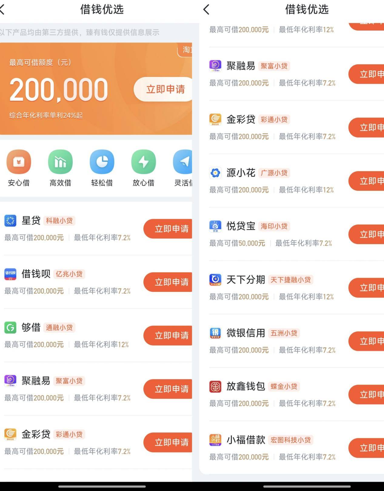 臻有钱的“借钱优选”也即贷款超市显示,其合作了近鑫用钱、星贷、借钱呗、够借、聚融易、金彩贷、源小花、悦贷宝、天下分期、微银信用、放鑫钱包、小福借钱、有钱钱包、惠易贷、人品借款、村村花、速贝钱包等近20家小贷公司。