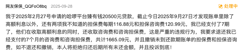 消费保上另一名用户投诉,“我于2025年2月27号申请的哈啰平台臻有钱20500元贷款......担保费每期116.88元和担保咨询费120.99元,我已经支付了7期。我要求退还我已经支付的7个月的咨询费和咨询担保费,共计1665.09元.......”