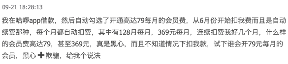一名用户投诉,“我在哈啰app借款,然后自动勾选了开通高达79元每月的会员费,从6月份开始扣我费,而且是自动续费那种,每个月都自动扣费,其中有128元每月,369元每月,连续扣费我好几个月,什么样的会员费高达79元甚至369元,而且在我不知道情况下扣我款,试想谁会开79元每月的会员?”