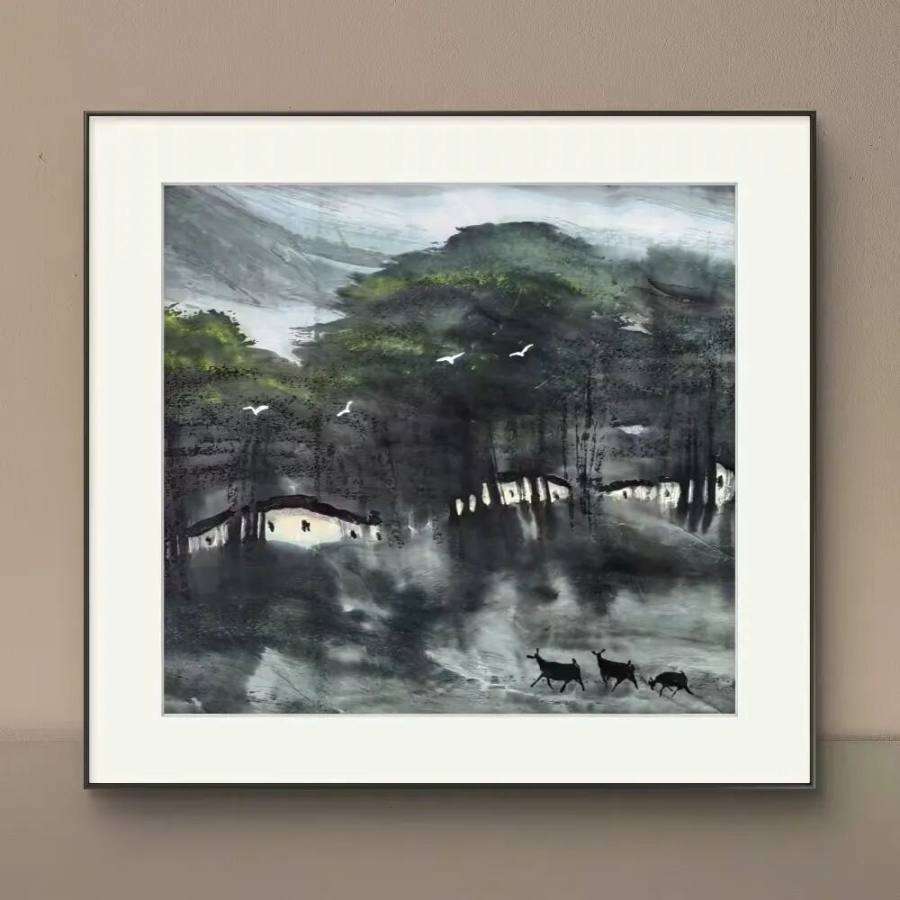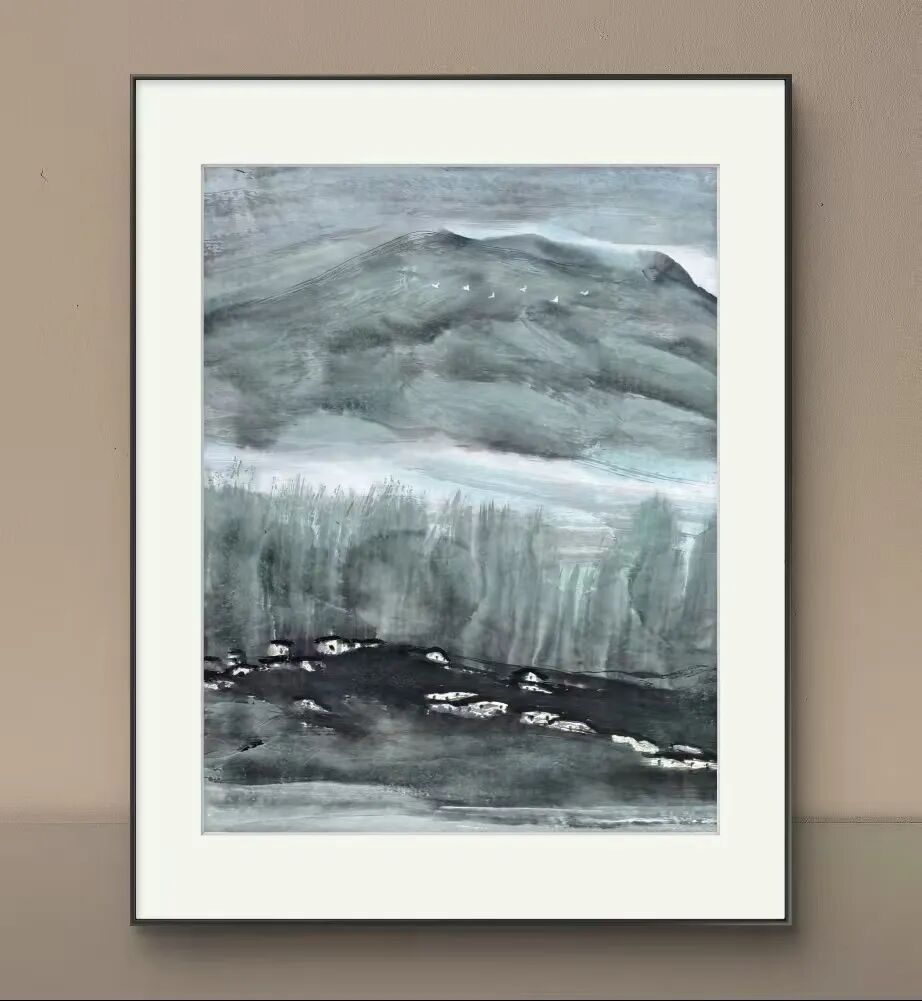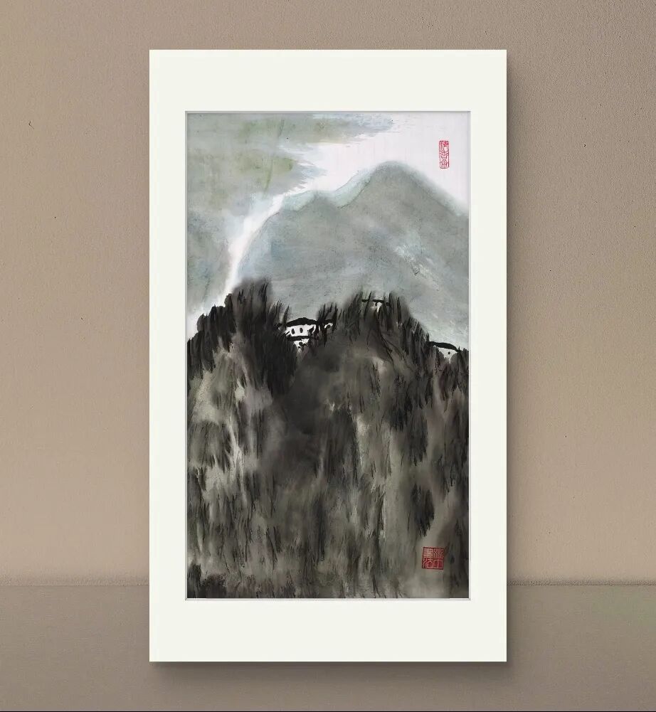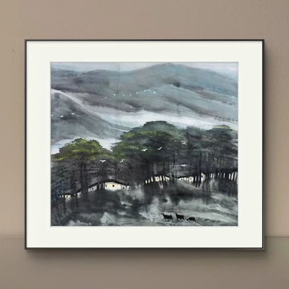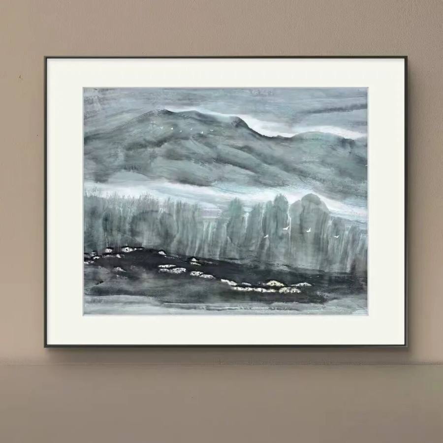 在余和平先生的山水画卷中,湘楚大地的灵韵是被赋予了诗性的重生。其笔墨深得南宗山水之精髓,自能于简淡中见浑厚,亦能在虚实处藏玄机。画面天地暝晦时,墨色如烟云吞吐,以积墨法层层晕染,晦明变幻间似可感受到湿润雾气;林麓蓊郁处,笔墨则裹挟着苍拙之气,始于混沌中隐现出松木勃发。包括画面层次的构筑——危峰叠嶂必以焦墨立骨,复以淡赭轻皴,待数遍积染后,必是上有巉岩欲坠飘云气,下有深涧含幽纳岚光。至于水田小景,先生也是常显留白之妙谛。素绢上,仅以数笔淡墨勾绘阡陌,薄雾横拖野汀,远岫隐现云根,大片虚空处似有晨雾流转。而这种"无画处皆成妙境"的写意营造,也恰是与“烟消一点一尘埃”的禅境相暗合。诗情逸气,足可聊以自娱耳!