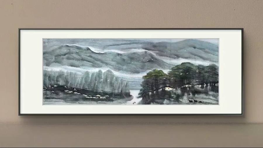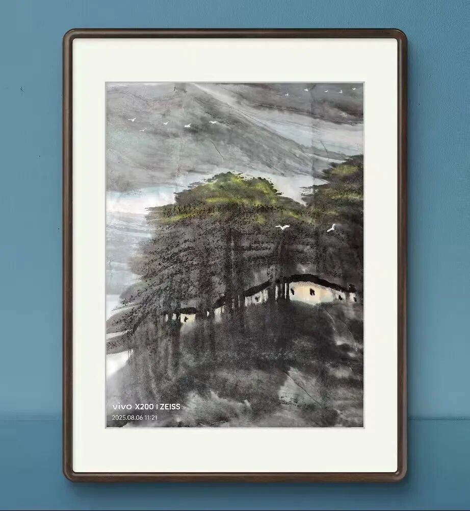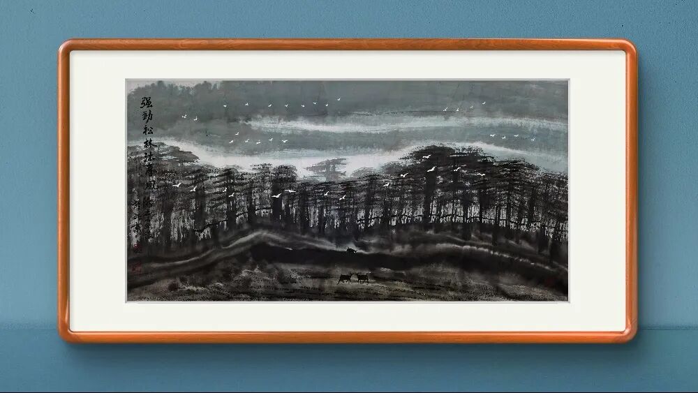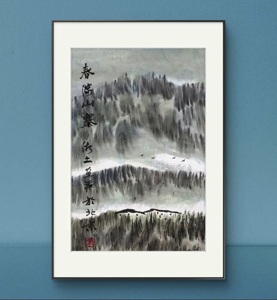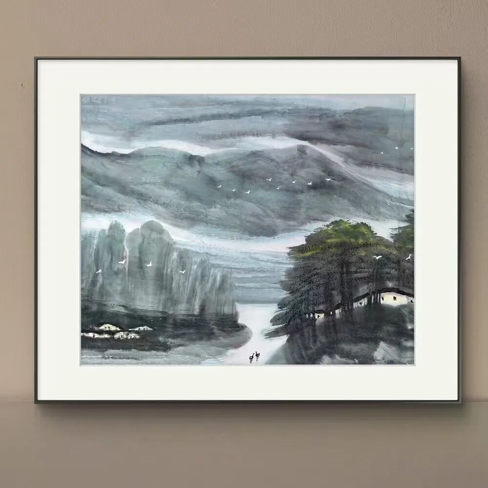 在余和平先生的山水画卷中,湘楚大地的灵韵是被赋予了诗性的重生。其笔墨深得南宗山水之精髓,自能于简淡中见浑厚,亦能在虚实处藏玄机。画面天地暝晦时,墨色如烟云吞吐,以积墨法层层晕染,晦明变幻间似可感受到湿润雾气;林麓蓊郁处,笔墨则裹挟着苍拙之气,始于混沌中隐现出松木勃发。包括画面层次的构筑——危峰叠嶂必以焦墨立骨,复以淡赭轻皴,待数遍积染后,必是上有巉岩欲坠飘云气,下有深涧含幽纳岚光。至于水田小景,先生也是常显留白之妙谛。素绢上,仅以数笔淡墨勾绘阡陌,薄雾横拖野汀,远岫隐现云根,大片虚空处似有晨雾流转。而这种"无画处皆成妙境"的写意营造,也恰是与“烟消一点一尘埃”的禅境相暗合。诗情逸气,足可聊以自娱耳!