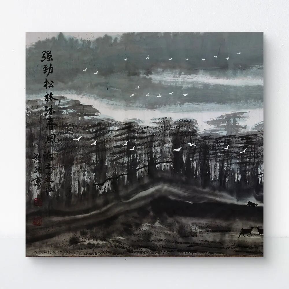古人论画云:“作画但须顾气势轮廓,不必求好景,亦不必拘旧稿。”看余和平先生之画,亦是如此!在创作上,他极力摆脱了摹绘蹊径,独创湘土泼墨皴写意山水技法,将传统水墨与湘地特有的地质肌理相融合,以狼毫蘸取饱墨,又通过腕力提按的韵律变化,在宣纸上形成斑驳润染的肌理效果。使画面能在淋漓酣畅间暗含精微,又能在水墨氤氲处尽显丘壑峥嵘,山之脉络,石之轮廓,树之挺干,皆是寥寥几笔即能成形,实不拘于貌似,惟在活而已!意在笔先,于冥冥中有气,在窈窈中有神,所谓不善用墨者练之不纯,墨色驳杂,浓淡失宜,纵能得其彩泽,而不能得其天然之气骨。今余和平先生之画,便就当属以墨取神之典范,臻乎此者,卓然于群。