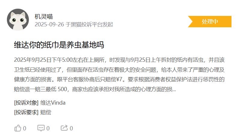 9月28日,一消费者表示,在电商平台旗舰店购买的维达无芯卷纸,其中一卷里面夹了一根两厘米的钢丝。其要求退一赔三,未满500元补偿500元;9月26日,一消费者表示在卫生纸内发现活虫,给本人带来了严重的心理及健康方面的危害;9月13日,一位女性消费者表示,8月26日在电商平台购买的维达湿厕纸内发现异物,向厂家反映后迟迟未获处理。由于该产品直接接触私处,她担忧对健康造成影响,要求进行身体检查并获得相应赔偿。