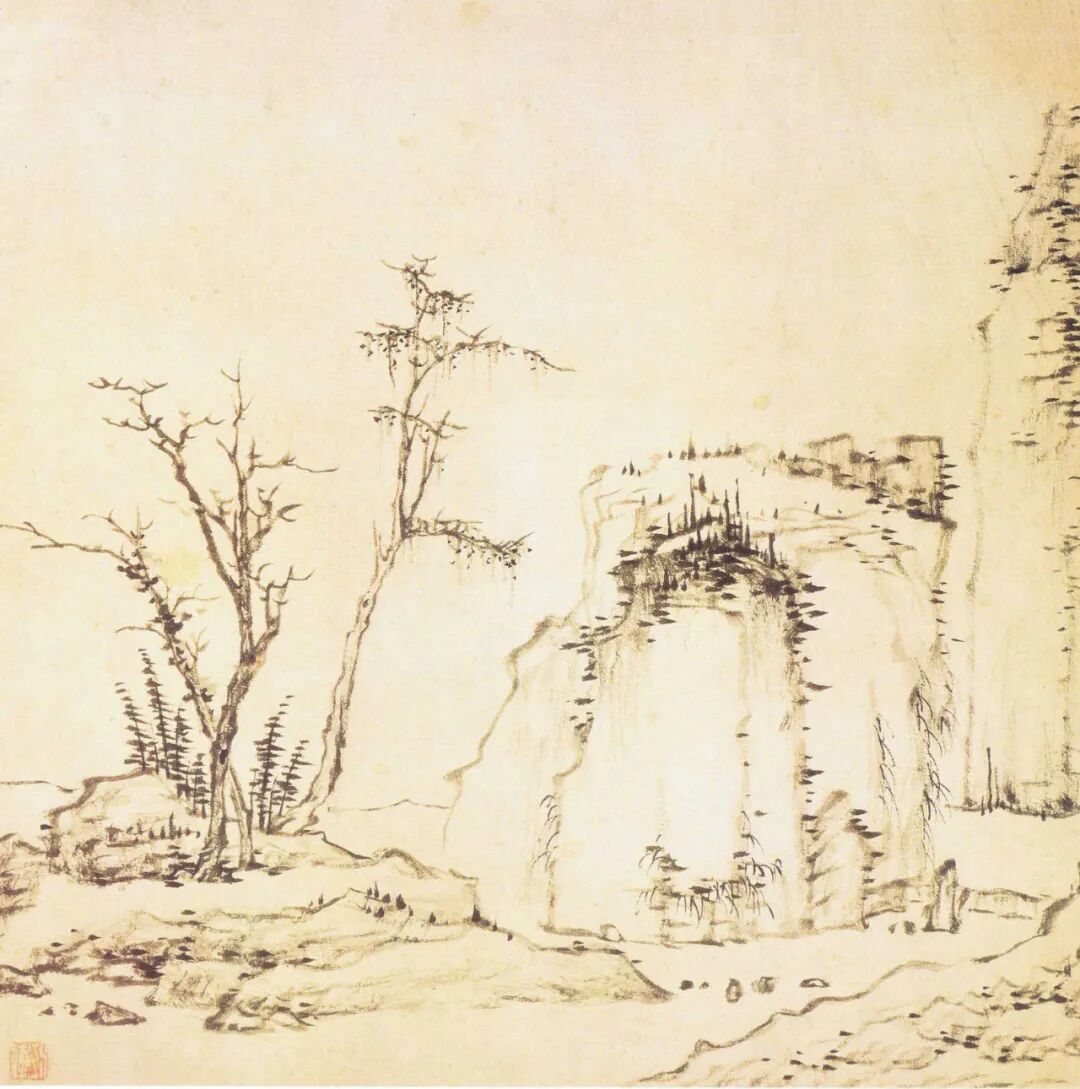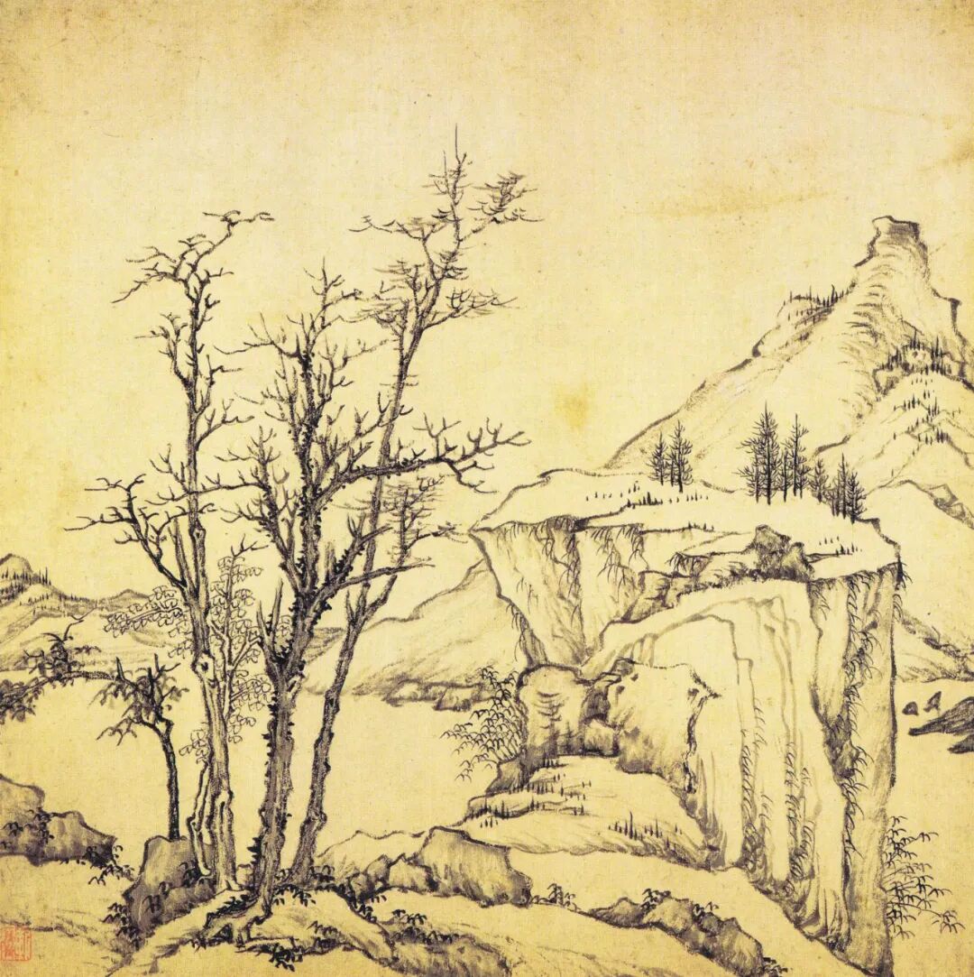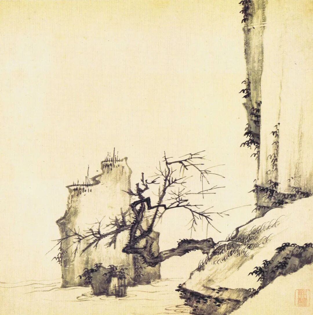 构局偏右立势,左隙广留,素地作水,远意由此延去。枯干当门,骨挺神警;峭壁相向,势若门阙。观者循岸而行,心随枝影起落;回望空天,胸次渐宽。此幅不尚繁妍,专守清严;不求奇幻,贵在真骨。