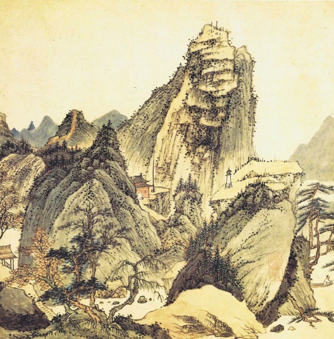 天柱凌霄,层岩如帛层叠,竖理千条直下,崖腹阴阳分明。其旁短岭并起,松篁密布,林烟自深。台地平展,石塔孤标;溪塍回抱,渚石点点。两处屋宇依崖而筑,朱檐映翠,山门半启。远岫花青轻罩,近坡赭土微渍,清气满幅,秋声在纸。