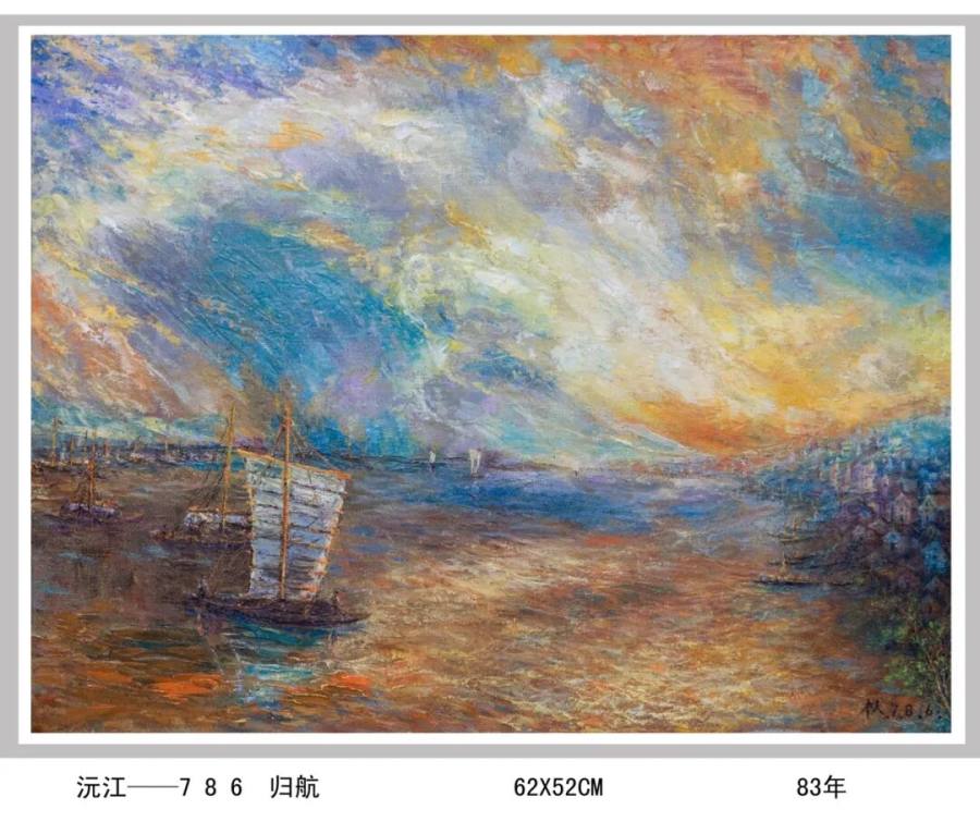 空间政治学的隐喻:画面未完成的笔触暗示改革开放进程的开放性。画布边缘突然中断的油彩肌理像一道未闭合的边界,颜料以液态形式向空白处渗透,既象征计划经济体制的逐渐解冻,又暗示市场经济的流动性正突破原有框架。这些看似随意的飞白笔触实则精心设计——刮刀拖拽出的纤维状缺口,与左侧规整的货船轮廓形成制度刚性与改革弹性的视觉对抗;而底层朱砂色从断裂处渗出,恰似意识形态底色在转型期的若隐若现。当暮色橙红在残缺边缘形成光晕效应时,整幅作品便超越了风景画的范畴,成为用油画语言书写的政治宣言——那些悬置的笔触不是技术的疏忽,而是留给未来的书写空间,正如1983年的沅江,正站在历史叙事的逗号之上。