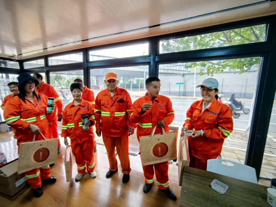 活动当日,环卫驿站内饼香与茶香萦绕交织,奏响一曲动人的暖心乐章。工作人员早已备好热气腾腾的花茶与香甜软糯的月饼,“橙衣天使”们围坐桌前,轻品香茗、细嚼月饼,幸福的笑容如秋日暖阳般明媚动人,现场处处洋溢着其乐融融的节日温情。活动尾声,工作人员向环卫工人代表郑重赠予包装精美的月饼花茶礼盒,以这份饱含心意的礼物,传递对他们的诚挚祝福与崇高敬意。