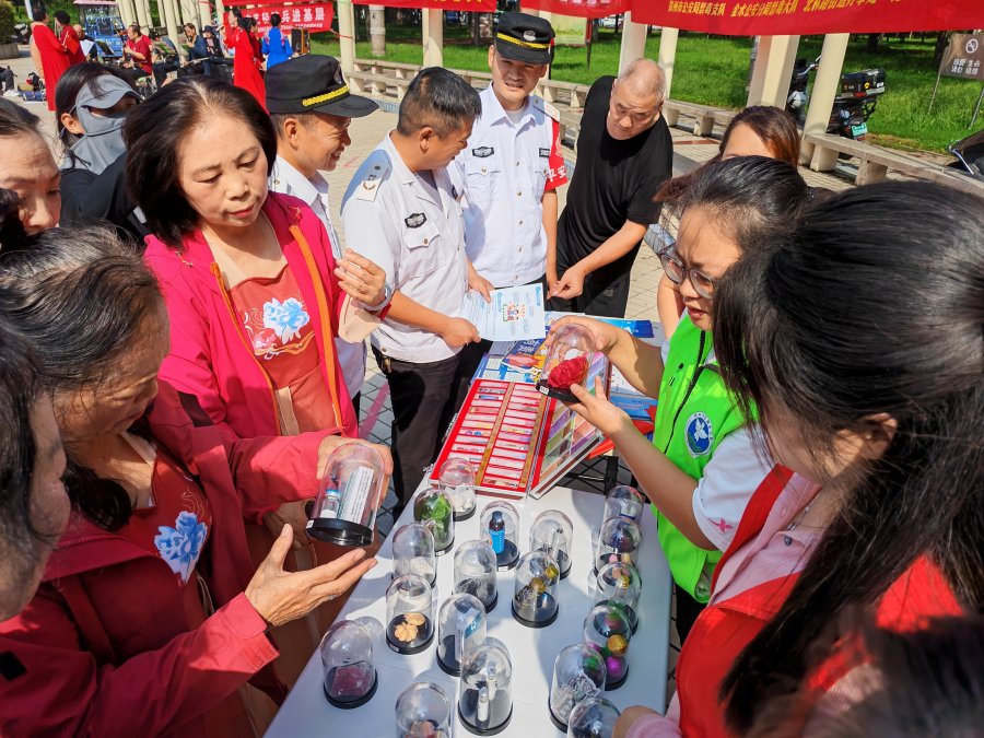 活动现场,大红色的宣传条幅一字铺设开来,鲜艳的色彩与清晰的标语格外醒目;主干道两侧的宣传展台也被居民们围得水泄不通,不少群众带着孩子提前到场,手里拿着志愿者发放的小红旗,翘首期盼文艺汇演开场。各参与单位的志愿者分工明确,一边有人在核心区域摆放海洛因、冰毒等传统毒品及“奶茶杯”“巧克力”等新型伪装毒品的仿真模型,用直观展示吸引居民驻足细看;一边有人忙着调试音响,反复确认文艺节目的流程细节,忙碌又有序的场景,让整个法治公园都充满了节日的活力。