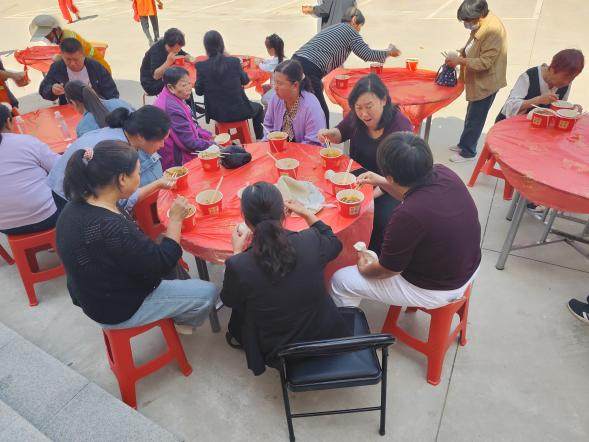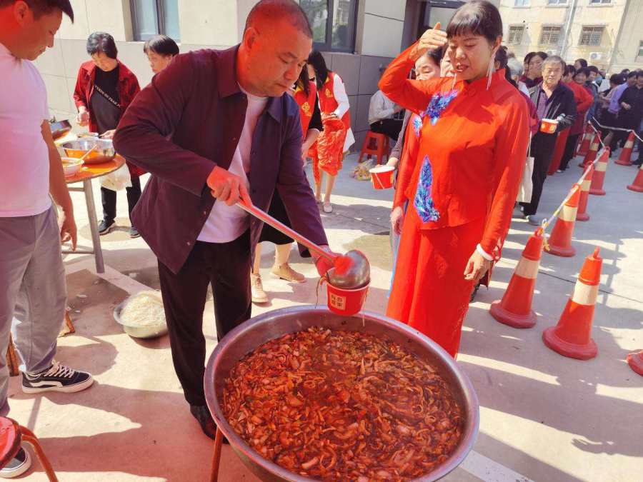 热气腾腾的大锅菜香气四溢,工作人员有序分发餐具,居民们围坐在一起,一边品尝着暖胃又暖心的家常菜,一边畅谈生活趣事,现场欢声笑语不断,浓浓的节日氛围与邻里温情在空气中蔓延。