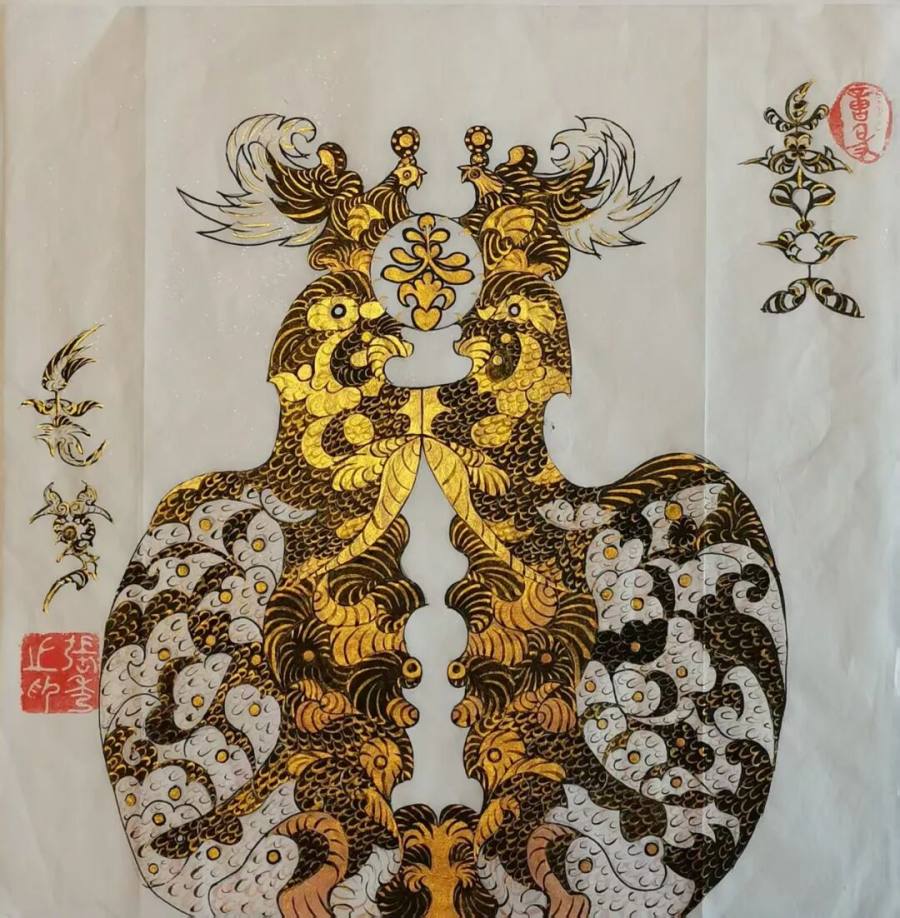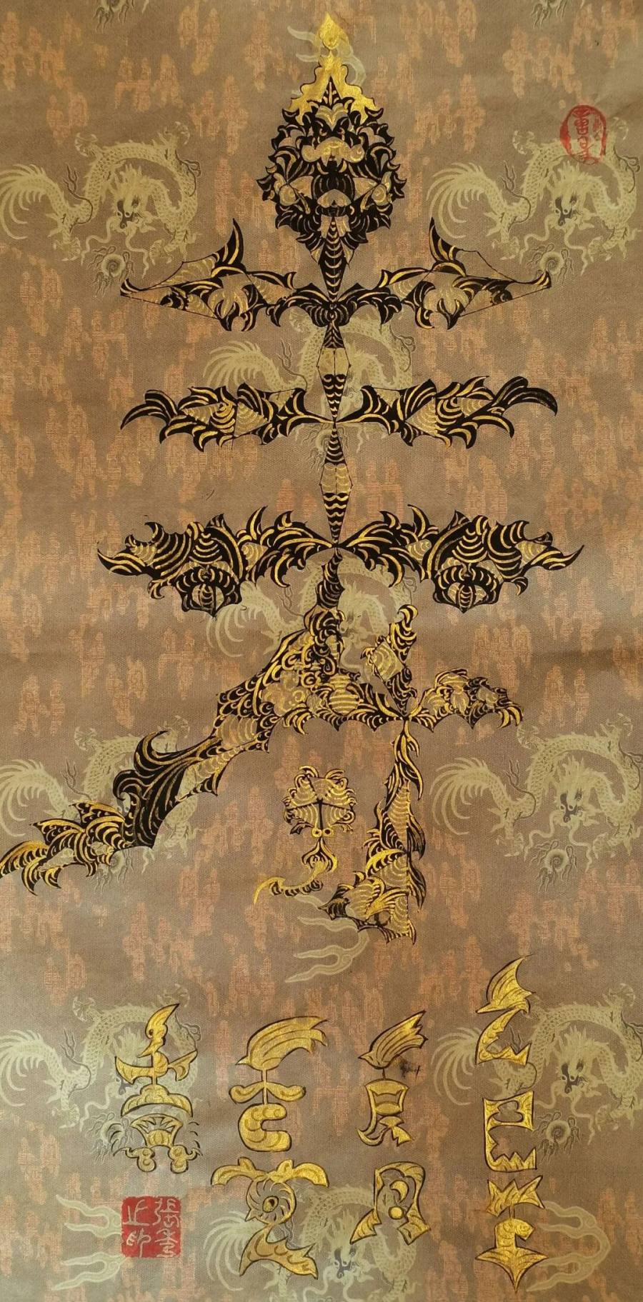 她的意象作品,以龙系列为主脉,以祈福为主旨,以中堂、镜面、楹联、斗方为主系,形成了雅俗共赏的美学影响力。,在中国传统文化中象征着力量、吉祥与尊贵。张秀芝女士笔下的意象书法龙,或矫健威猛,或灵动飘逸,充满生命力和庄严感。这样的作品无论是悬挂于高雅的艺术殿堂,还是装点在寻常百姓的家中,都能给人带来美的享受和心灵的慰藉。普度众生,皆得欢喜,张秀芝女士的作品以其独特的魅力,关照着善男子善女人的心灵。基于佛法弘扬,显于道法传播,具有突出的文化价值和崇高的文化定位。