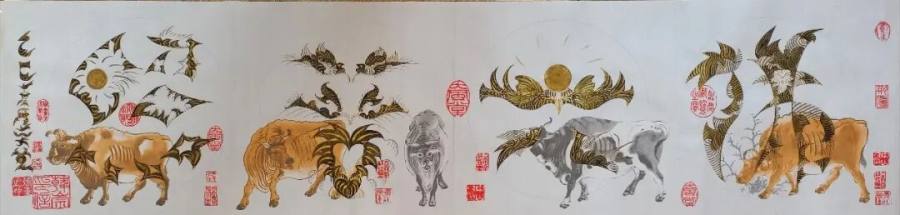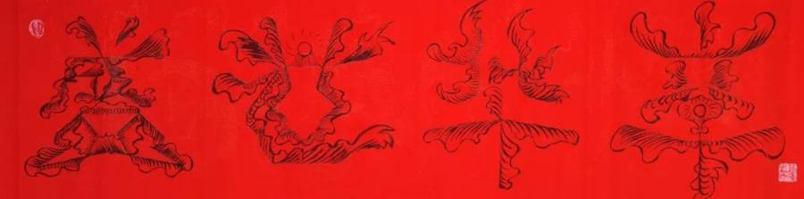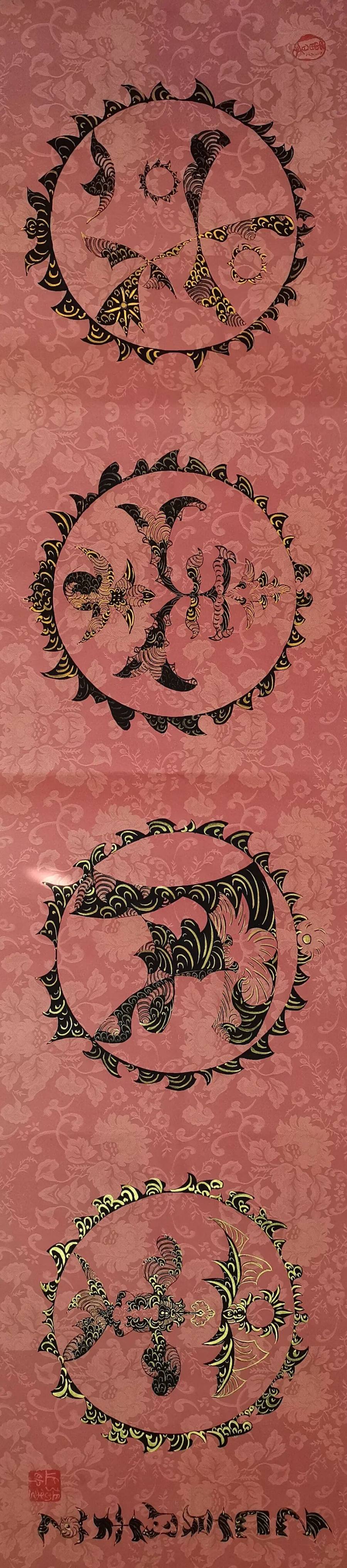 她的笔墨革新绝非寻常,而是以哲思为骨、信仰为魂的艺术觉醒。佛经偈语与道家经典在其笔下化作跃动的符号,四屏中堂宛如灵符,字中有画、画中藏谶,既承袭甲骨文的象形基因,又注入当代人对吉祥寓意的精神渴求。藏家悬其墨宝于厅堂,竟觉屋内气流和畅,心绪渐宁,这正是其人宇合一理念的玄妙再现,意象作品通过视觉共振激活人体能量场,让书法超越赏玩,成为调和命理、滋养身心的文化法器。