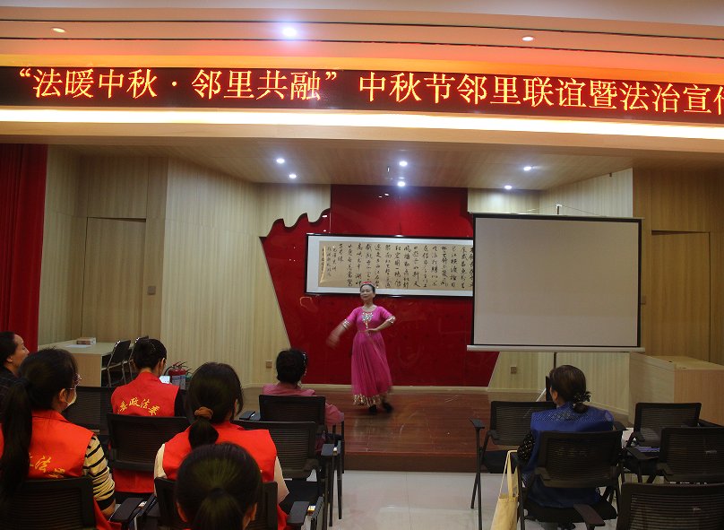 茶话会环节,社区居民登台献艺,舞蹈《苹果香》、歌曲《花好月圆》等节目轮番上演,展现社区文化活力。活动尾声,社区工作人员与居民共同合唱经典曲目《但愿人长久》,将团圆氛围推向高潮。居民张阿姨感慨道:“和邻居们一起过节、学法,这个中秋既热闹又暖心!”
