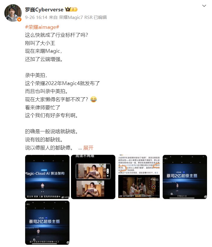 罗巍晒出荣耀发布会现场截图及vivo新机发布会截图对比照,并表示:“这么快就成了行业标杆了吗?刚叫了大小王现在来蹭Magic,还加了云端增强。录中美拍,这个荣耀2022年Magic4就发布了,而且也叫录中美拍。现在大家懒得名字都不改了?看来律师要忙了,这个我们有好多专利啊。的确是一般说啥就缺啥,说有钱的都缺钱,说以德服人的都缺德,说本分的都不本分,说没水军的,那基本是可以水漫金山。”