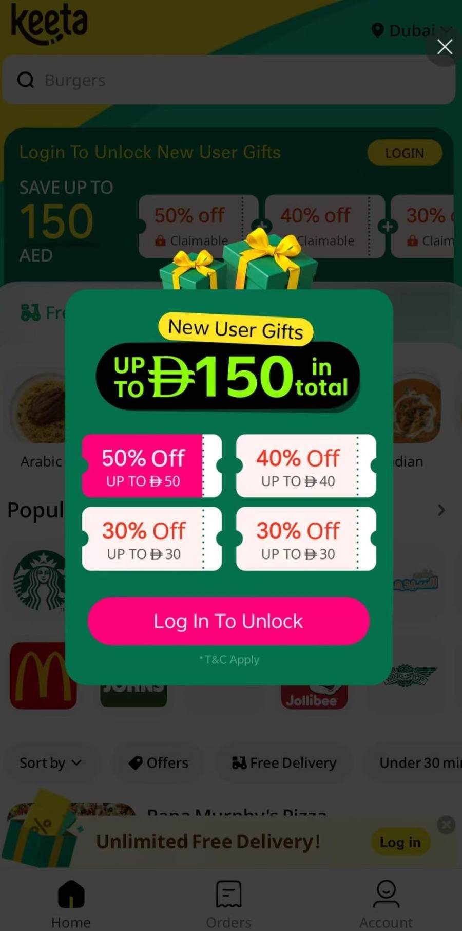 Keeta在迪拜,最高优惠可达150迪拉姆(约合291.34元人民币) 图片来源:App截图