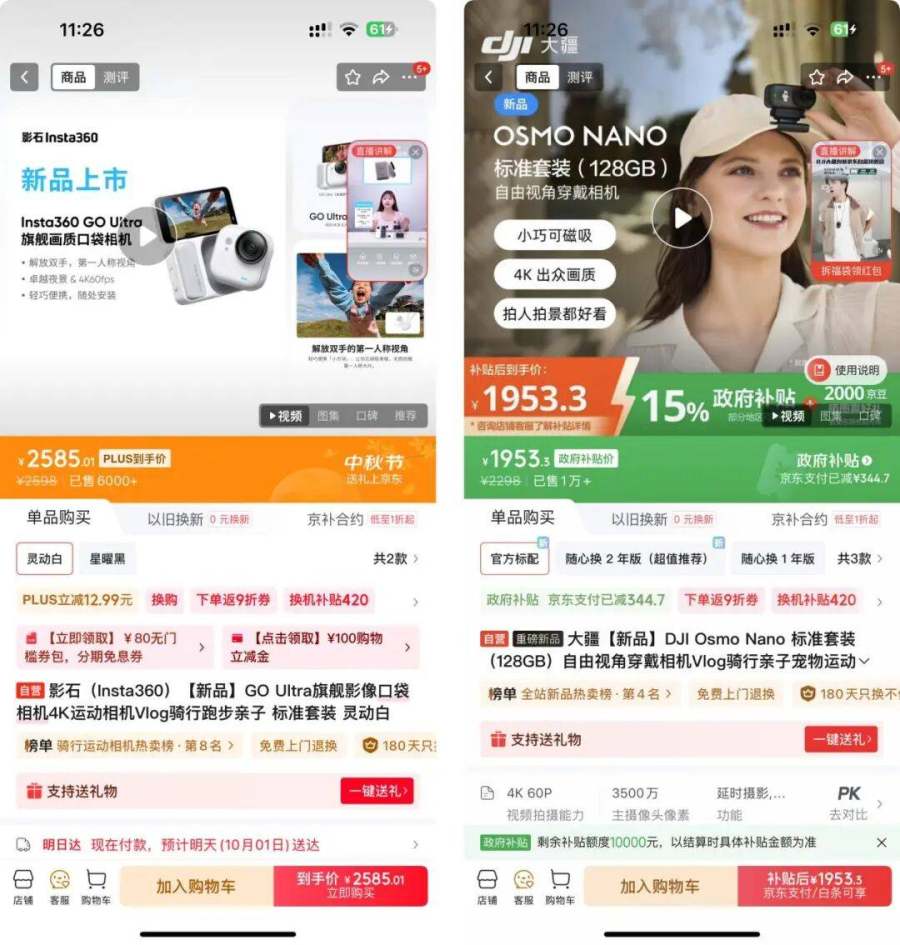 9月23日,大疆发布了首款自由视角穿戴相机Osmo Nano,该设备在产品和功能上均与影石创新8月21日发布的GO Ultra形成了直接竞争关系,在价格上叠加国补还便宜了近千元。