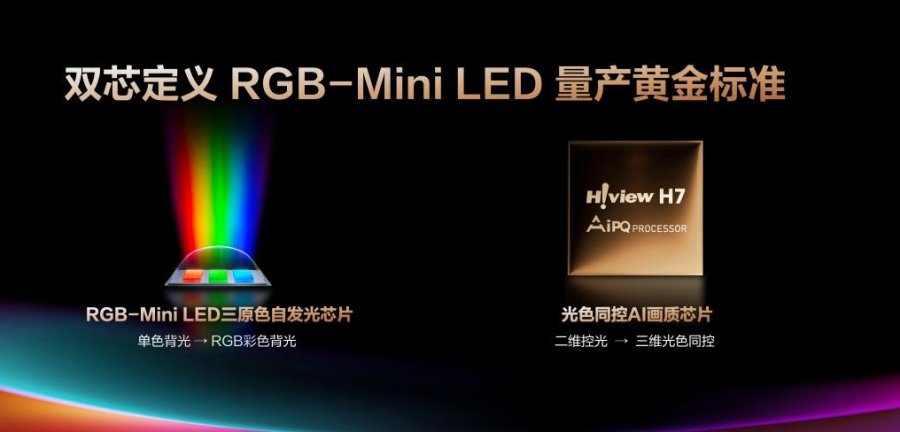 海信自研了全球领先的RGB-Mini LED发光芯片,解决了传统RGB LED发光效率低、寿命短、色偏明显、色纯度不足等顽疾。