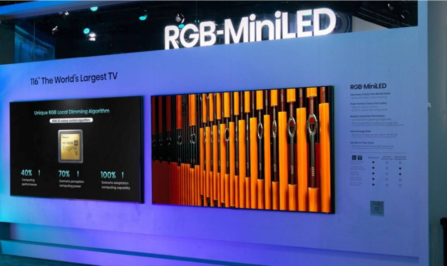 QD-OLED由于技术的桎梏,难以商业化量产100英寸以上的电视,而RGB-Mini LED则没有这个限制,全球首款量产的RGB-Mini LED电视海信UX轻而易举地做到了116英寸,一跃成为全球最大的超旗舰电视,掀起了“色彩原生革命”。