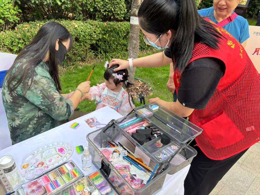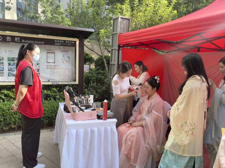 游园会现场,最吸睛的当属汉服体验区。几张化妆桌前围满了居民,专业妆造师正细致地为大家描眉、盘发、整理裙摆,从孩童到老人,都跃跃欲试换上襦裙、曲裾。无论是灵动襦裙还是雅致曲裾,穿上就能秒变“古风达人”,随手拍都是氛围感大片。不少家庭还特意拍了古风全家福,定格这份独特的中秋记忆。
