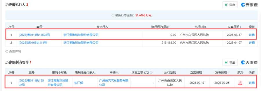 但就在同一天,广州市白云区人民发院也对零跑汽车及其法定代表人朱江明实施了限制消费措施,同时将零跑汽车列为失信被执行人。