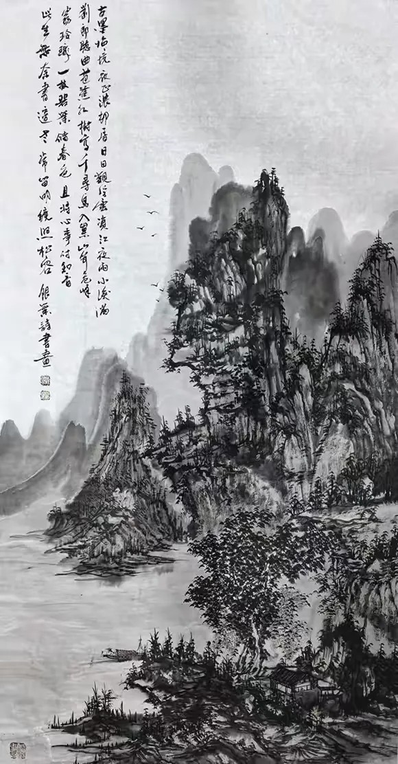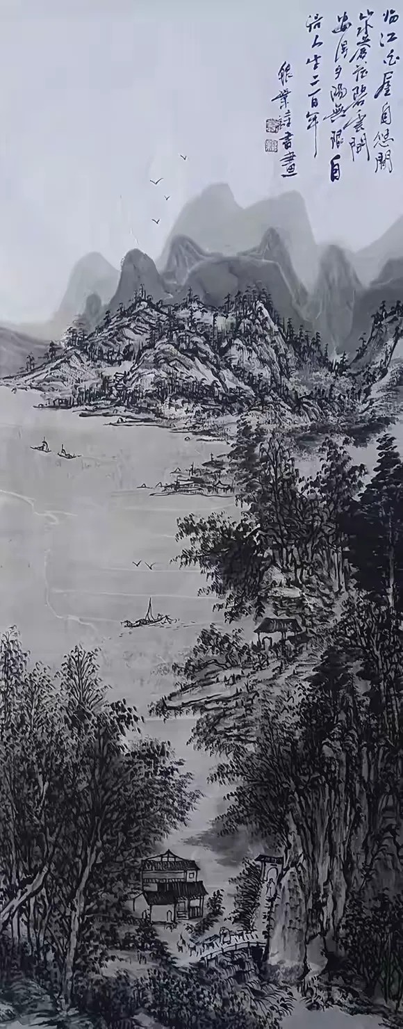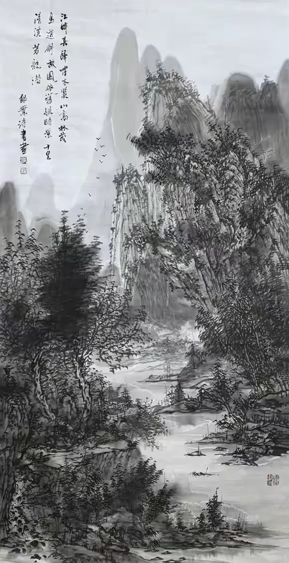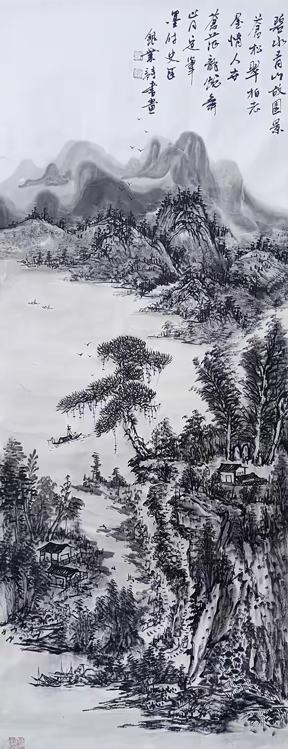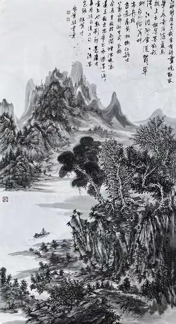 我觉得他的成功并非偶然。首先,他的画意境高古;其次,他文学功底深厚;再次,他笔墨功夫老道。他崇尚传统,向古人要营养,深耕传统数十年;他是画家,同时也是作家,诗人和词赋家,诗词歌赋样样精通;他年少成名,不到三十岁便凭借几部精美的诗集加入了中国作协,文名满天下;中年时弄小说,竟鼓捣出几部长篇,而且是章回的那种,古意盎然,深受好评;老来又以词赋驰名海内,其才思之敏捷,我等难望其项辈,洋洋千言,倚马可待。他曾多次在北京成功举办个展,并加入中美协。他的画中有诗,诗中更有画,在传统中创新,在创新中守成。如此强龙,能不飞天?!