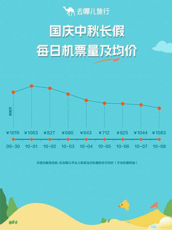 去哪儿旅行大数据研究院研究员蔡木子分析,今年国庆、中秋双节连休,假期天数比去年多一天,出游与阖家团圆需求叠加,家庭多人出游占比增幅明显,助推总体出行量快速增长,预计今年国庆中秋假期整体旅游热度将超以往。此外,机票价格从10月2日起将有明显下降,10月4日达到相对低谷,大家可以考虑错峰出游。
