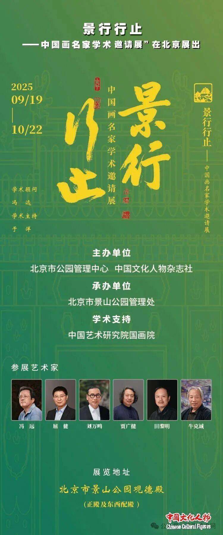 “景行行止——中国画名家学术邀请展” 将于2025年9月至10月在北京市景山公园观德殿(正殿及东西配殿)举行。展览不仅是一次中国画坛的高品格学术集粹,更是“为人民而艺术”的文化惠民的艺术践行。展览由北京市公园管理中心和《中国文化人物》杂志社主办,北京市景山公园管理处承办,并邀请中国艺术研究院国画院学术支持。