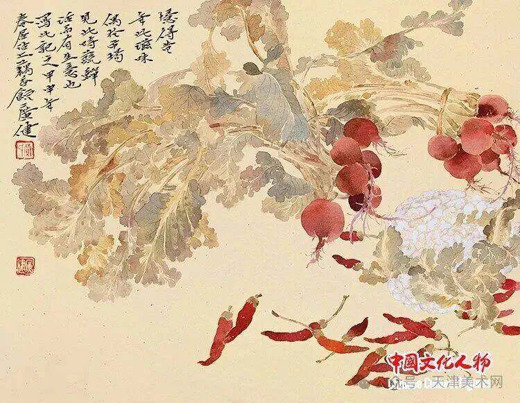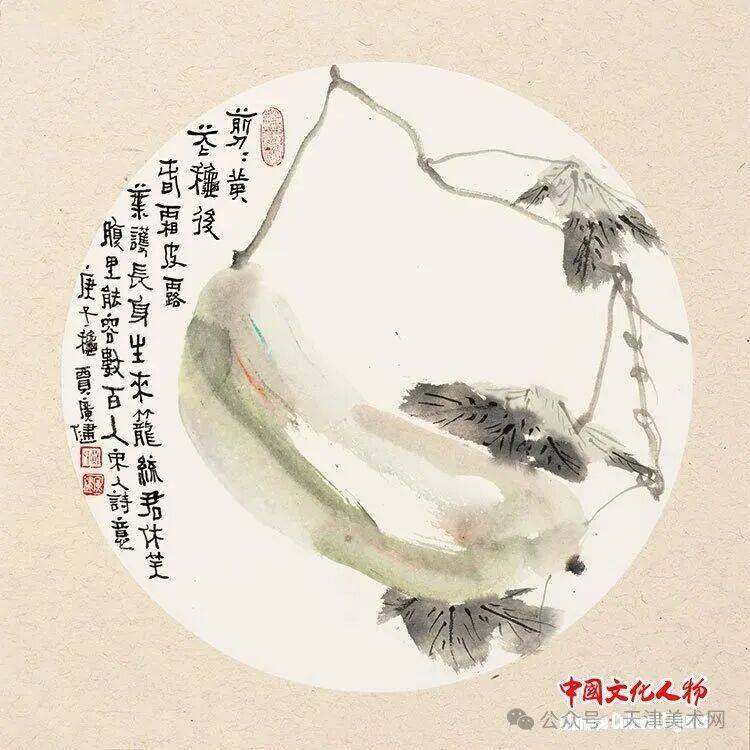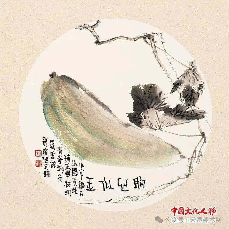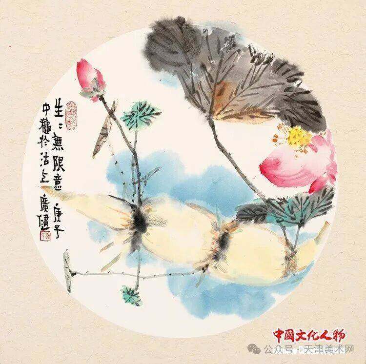 贾广健先生的花鸟画创作深研传统笔墨精髓,汲取与消化了明清写意花鸟画、没骨花鸟画的传统,特别是“青藤白阳”与吴门画派画法风格,保留文人笔墨抒情味道,将传统花鸟画章法与现代构成冶于一炉。无论是乡间的藕节与秋瓜,还是故园的红花和墨叶,都带着独有的灵动清气和盎然生机。