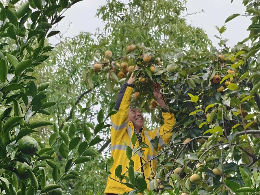 (图为该镇八里王村村民在自己的院落里脸上洋溢着丰收的喜悦正采摘柿子)