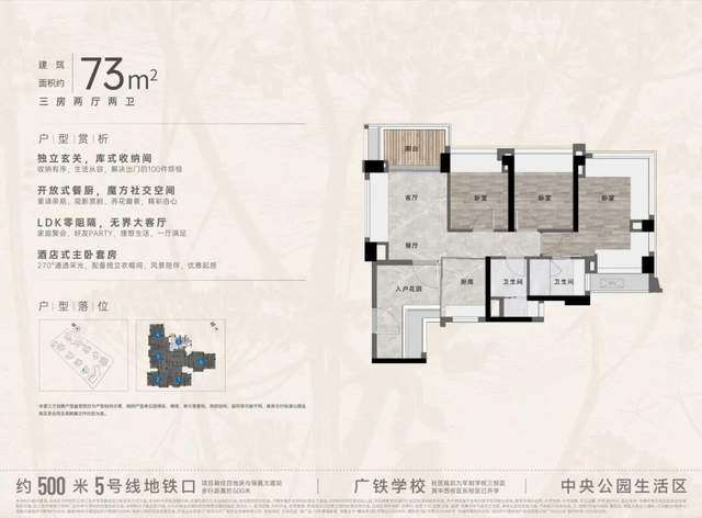 先来看最亮眼的建面约73㎡户型,面积小巧却空间感十足。