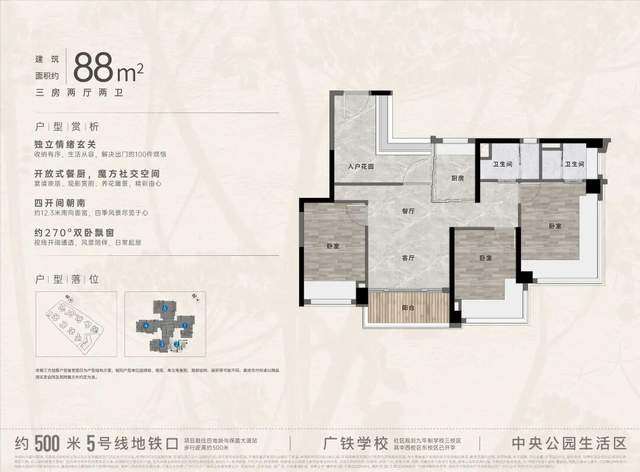 再来看强推的建面约84-88㎡户型,可以说是超新规时代的最强三房代表作。