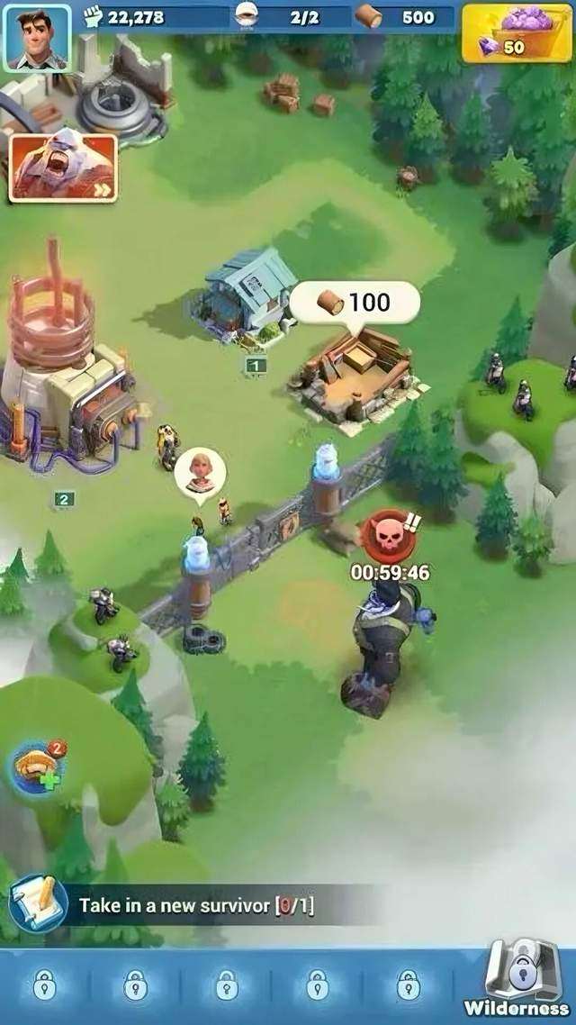 在初期,玩家在“末日”设定下最大程度地享受休闲类玩法。生存没有难度,就算是新手也毫无门槛,只需要在关键节点买礼包、狩猎、采集资源,靠简单便捷的快速升级体验爽感和成就感。