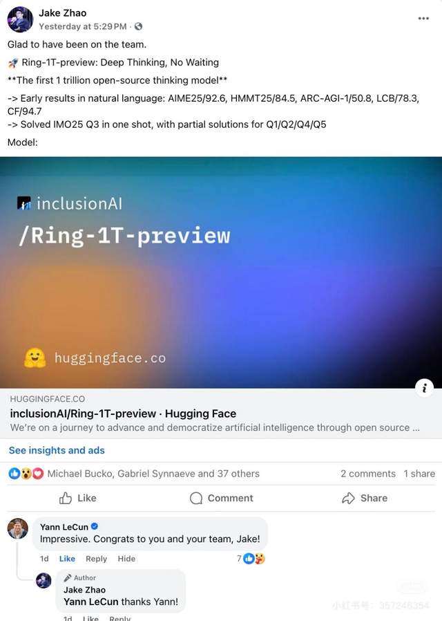 中国大模型也引起了图灵奖得主杨立昆的关注。就在9月30日,蚂蚁集团旗下百灵大模型宣布开源其思考模型Ring-1T的预览版Ring-1T-preview,参数量达1000B(1万亿)。“令人印象深刻,祝贺你们的团队。”在百灵最新思考大模型发布后,杨立昆在社交平台上也给中国大模型点了赞。