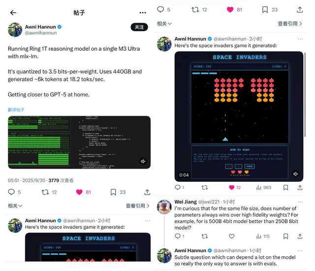 有苹果工程师在单个M3 Ultra芯片上运行Ring-1T-preview,量化的效果接近GPT-5,还能直接生成《太空侵略者》小游戏。