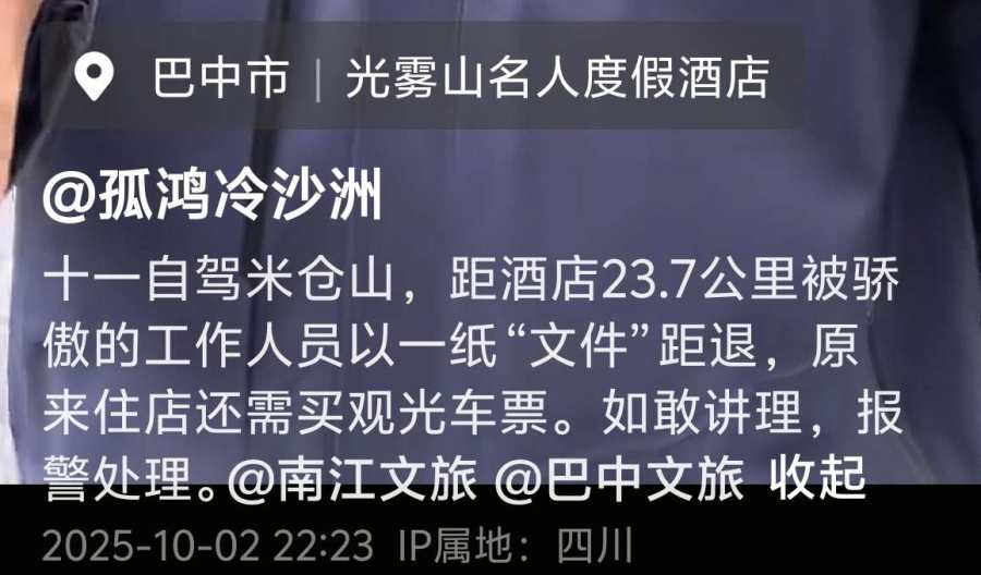视频中呈现了这样的场景:网友在双节期间预订了光雾山景区酒店,在与景区工作人员的对话中,工作人员上来就打开光雾山公众号里面的推文,称文件规定得明明白白。当网友询问入住酒店是否需要重新购买观光车费用时,工作人员答复需60元。网友进一步追问这60元是观光车费用还是包含门票,工作人员则表示所有游客都需乘坐观光车,景区不允许自驾游,依据就是所谓的文件规定。更让游客为难的是,车子只能停在二十公里外的停车场,这无疑给游客增添了极大的不便。