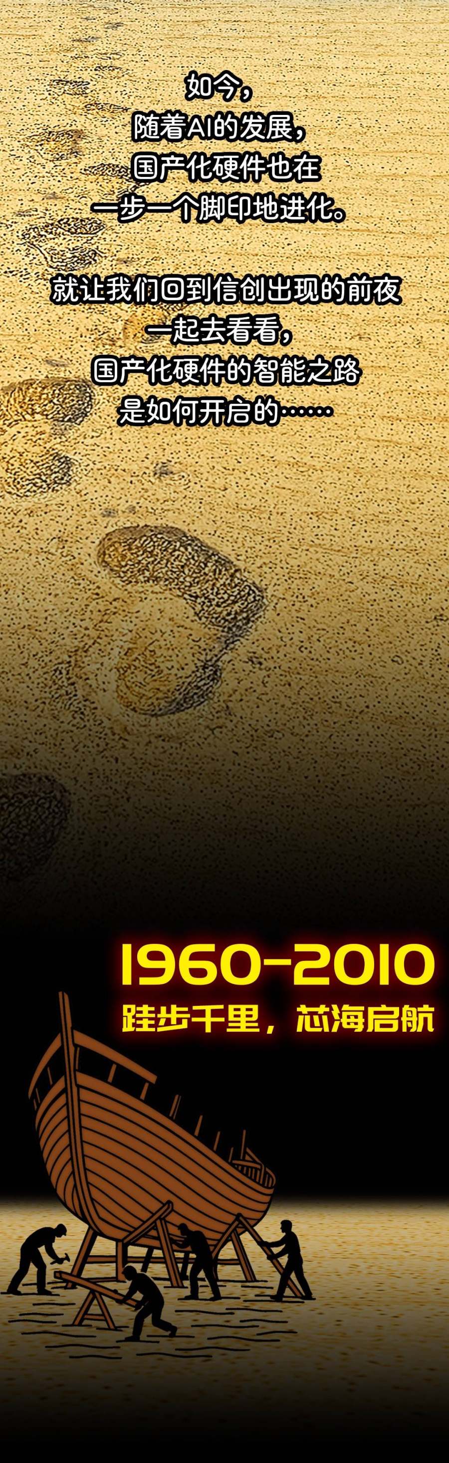 在中国科技迈向自主创新的征程中,西方主导的信息技术体系曾是我们必须跨越的鸿沟,面对无路可退的境地,我们唯有自力更生,将关键技术自主权牢牢掌握在自己手中。从半导体到操作系统,从智能终端到人工智能,我们必须亲手构建起一座自主可控的“数字长城”。这条风雨兼程、砥砺前行的道路,浸润着奋斗与梦想,它名为“信创”。如今,随着人工智能浪潮的奔涌,国产硬件正稳步扎实地向前迈进。现在,就让我们回溯至信创启航的前夕,共同探寻国产化硬件的智能化征程最初是如何开启的。