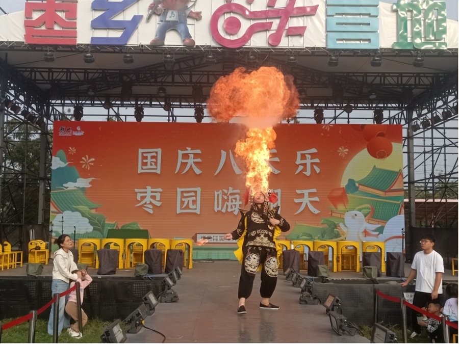 夜幕降临,枣园热闹更甚。“群星闪耀百姓大舞台”前挤满了想秀才艺的游客,刚唱完一首歌的小伙难掩激动:“这辈子没上过舞台,没想到在这儿圆了梦,还赢了奖,太值了!”非遗“火壶表演”登场时,烧红的铁壶在师傅手中翻转,火光与技艺交织,溅起的火星子让游客纷纷屏息凝神,随后掏出手机录下震撼画面发朋友圈。