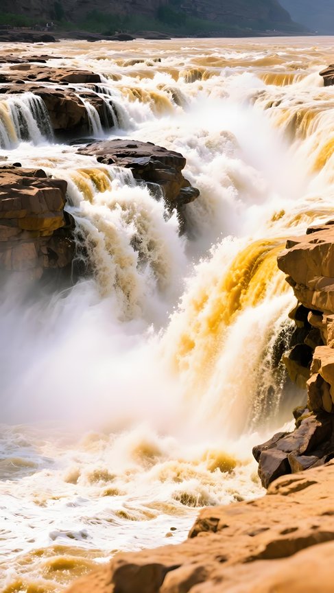 黄河一头扎进秦晋大峡谷,突然就被挤进了一道狭窄的“石嗓子眼儿”。四十万吨浑浊的大水,裹着青藏高原的碎雪和黄土高原的泥沙,从高高的断层上一跃而下!那声音大的震耳欲聋,简直像把古老的编钟大鼓、商周的祭祀音乐、汉代的宏大舞蹈,一股脑儿全融进这日夜不停的轰隆声里,成了瀑布永不停歇的交响曲。