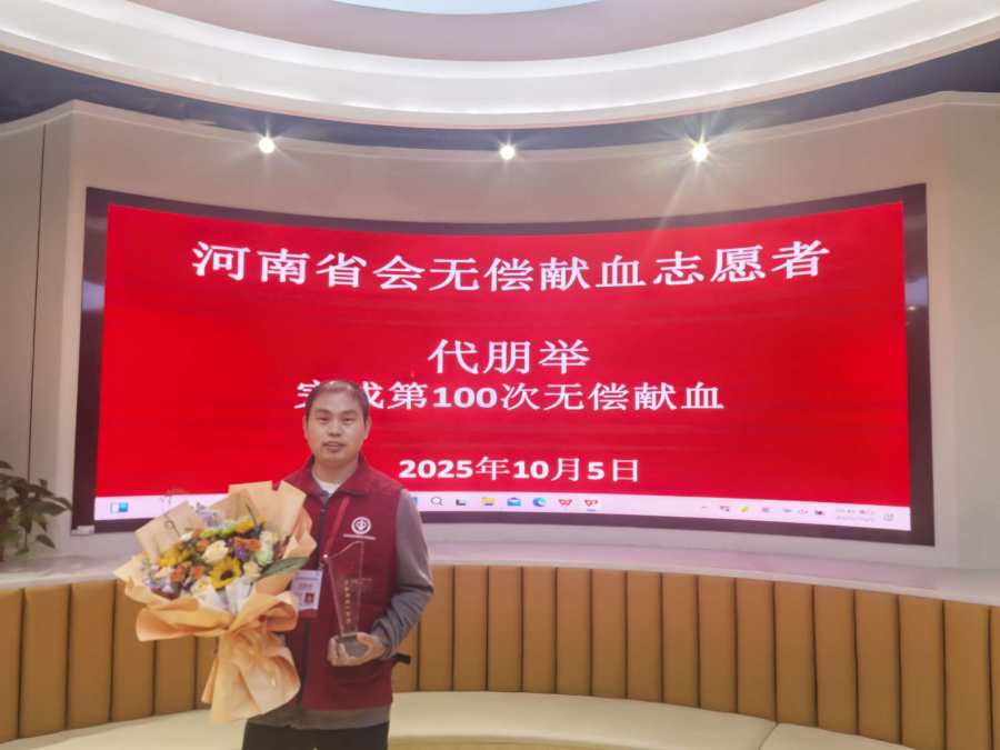 在金色的十月,秋风送爽的季节里,郑州街头洋溢着节日的喜庆。一位普通市民用自己独特的方式为祖国庆生,他叫代朋举。10月5日上午,在众多志愿者的见证下,他完成了人生中第100次无偿献血,用热血书写着对祖国最深情的告白。