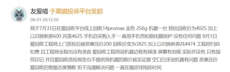 有用户在“黑猫投诉”平台表示,其7月31日在爱回收线上提交了一台iPhone 14 Pro Max(金色 256GB)的回收申请,平台初步估价为4025元,加上以旧换新补贴券合计4625元;该用户表示手机自购买以来一直贴膜戴壳,无磕无碰,成色良好。
