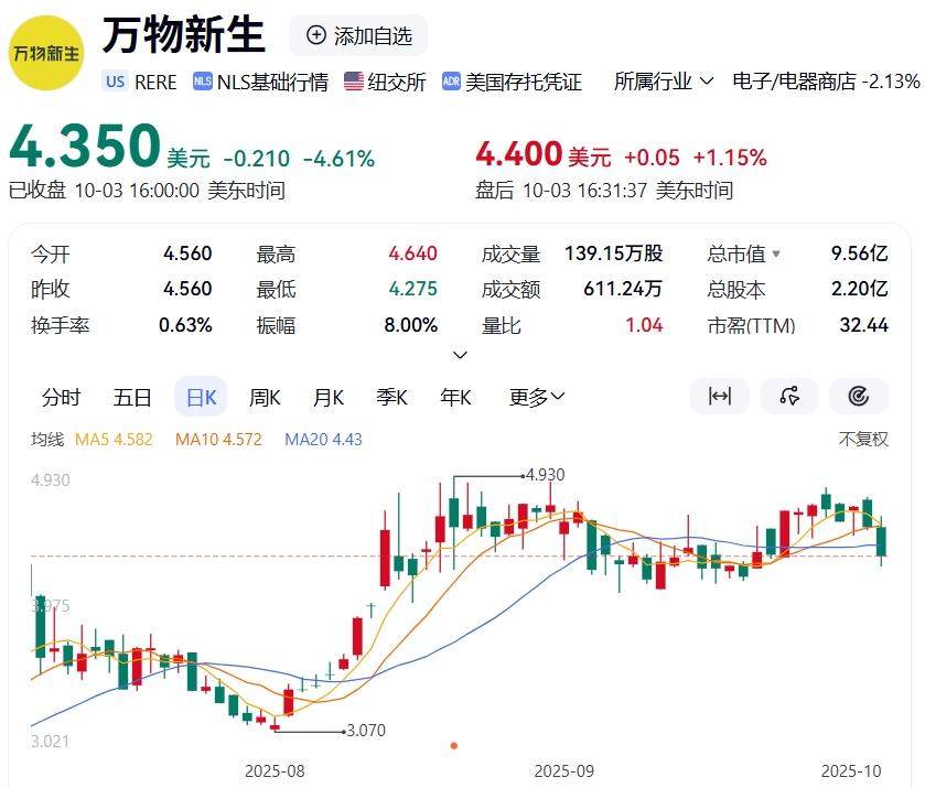2021年6月18日万物新生上市当天,其股价上涨22.93%,超过18美元/股,总市值37.93亿美元;然而4年多过去,截至10月3日收盘,万物新生股价已然跌到4.35美元/股,较上市当天高点跌去近75%,当前总市值不足10亿美元。