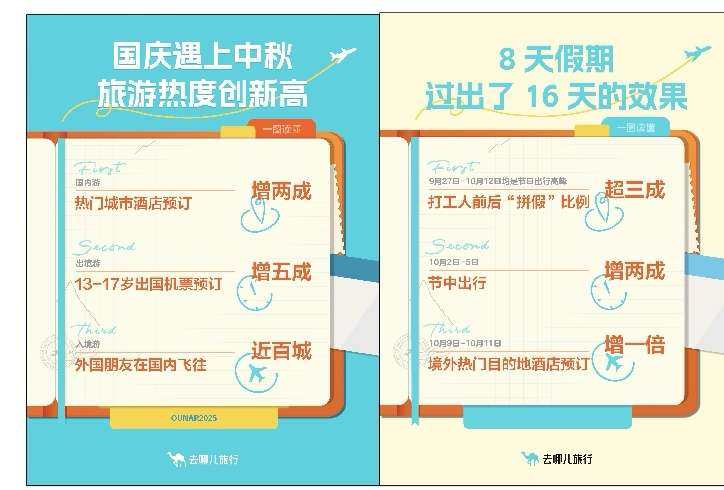 国庆遇上中秋,8天长假,旅游热度创新高。去哪儿旅行大数据显示,国内游方面,热门城市酒店预订量同比增幅超过两成;出境游方面,热门目的地出境机票预订量同比增幅超三成,尤其是青少年和大学生群体,出境机票预订增幅超五成;入境游方面,使用非中国护照预订国内航班的机票量同比增长超过三成,覆盖了国内近百个城市。更长的休假时间,也让更多人拼假错峰出行,8天假过出了16天的效果。